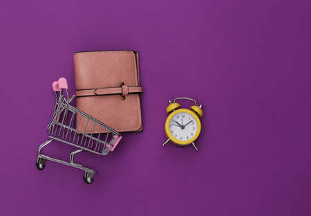 Mini supermarket trolley with purse and retro alarm clock on purple background. shopping time. top view.