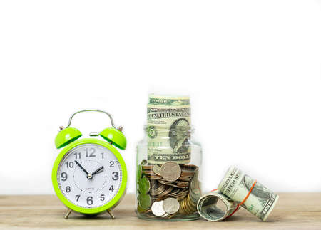 Green alarm clock and coin in glass jar and dollar bills on isolate white background. Concept of money saving.
