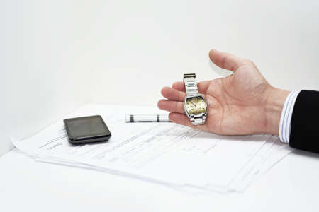 Hands show the clock on a blurred background. The concept of controlled time in business.