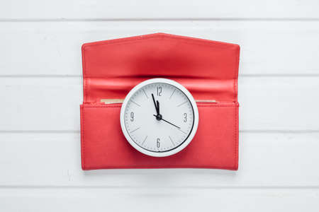Time to make money. White clock and red wallet on white wooden background. Minimalistic studio shot. Top view
