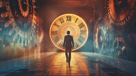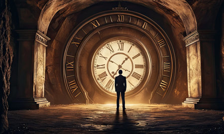Surreal image of a businessman standing in front of a giant clock in a mysterious landscape, symbolizing time management and deadlines