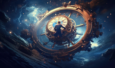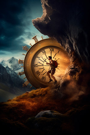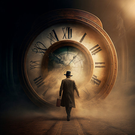 An AI generated illustration of a man in a dramatic scene underneath a unique clock suspended above him