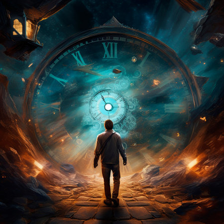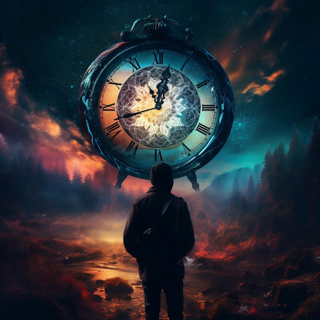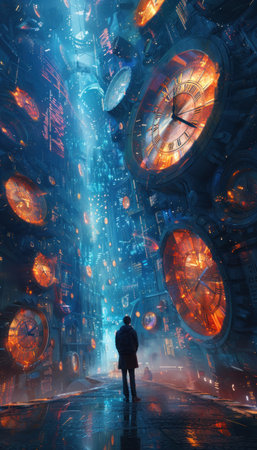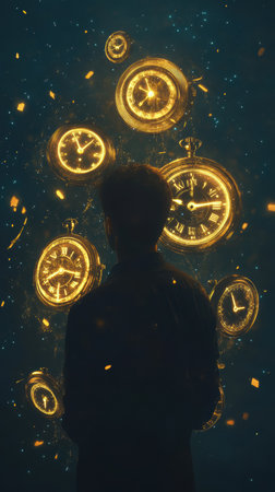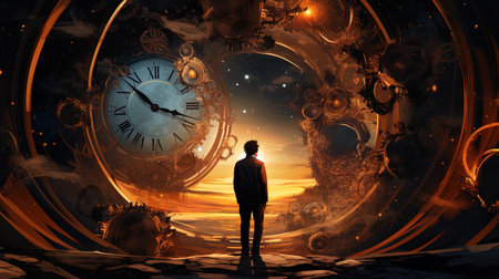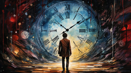 A man stands with his back to the viewer, illuminated by glowing clocks floating in a dark, starry background. He appears to be lost in thought, reflecting on time.