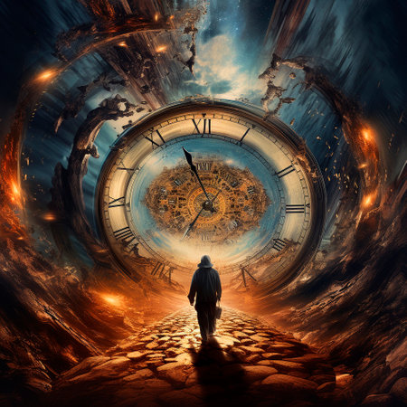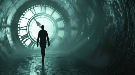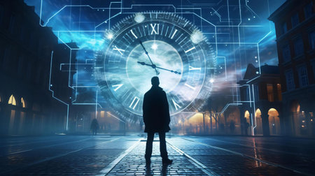 Mysterious human figure in time loop concept with futuristic elements.