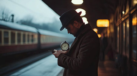 A stylish man in a hat checks the time on his phone at a train station, with a vintage train gliding past, capturing a moment of anticipation and nostalgia.