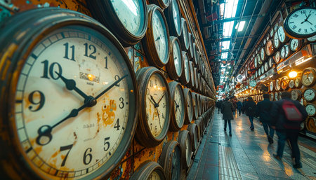 A captivating low-angle view down a long corridor where walls are adorned with a vast collection of vintage and antique clocks.
