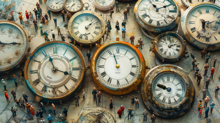 A digital composite of various clocks showing different time zones, surrounded by swarms of miniature people