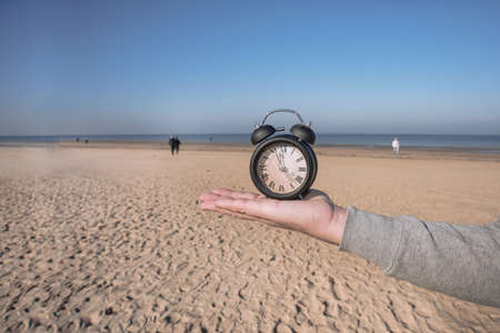 Image of spring Time Change. Summer back concept. Vintage alarm Clock outdoors