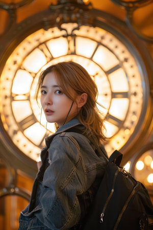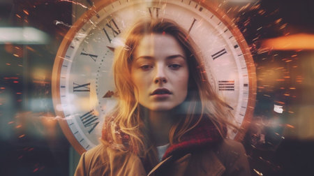 A captivating portrait of a young woman bathed in the soft glow of an illuminated vintage clock The intricate details of the clock and the woman's elegant features blend seamlessly, creating a timeless atmosphere This stunning image evokes a sense of history and beauty, making it perfect for projects that require a touch of vintage elegance AI Generative