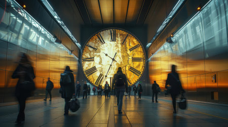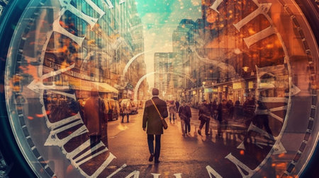 generative ai illustration of a clock over a picture of blurred people in the city, symbolizes the hustle and bustle of today's life