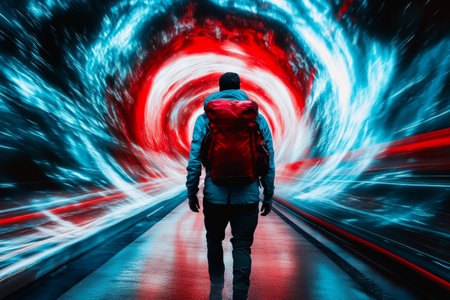 Lone traveler in a vortex of red and blue light on a futuristic journey.