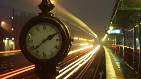 The station clock stands out amidst a flurry of light trails marking the passage of time as trains and cars constantly come and go