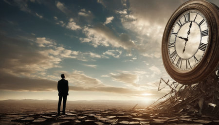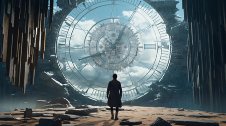 A solitary figure witnesses the breaking of a grand clock, illustrating the impermanence of time against a dawn landscape. A poignant metaphor for stock collections. AI generation