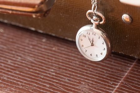 vintage pocket watch closeup on old leather suitcase