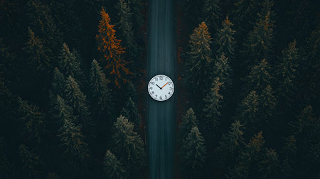 In a mystical forest, a giant clock rests on a road, surrounded by dark green and orange trees. The atmosphere evokes wonder and tranquility, blending nature and the concept of time beautifully.