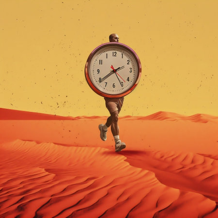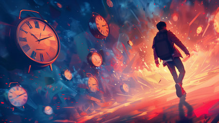 A lone figure strides through a vivid environment where clocks float, representing the challenge of managing time effectively