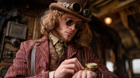 Portrait of a handsome steampunk man in hat and glasses.