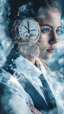 A woman with a clock on her chest and clouds in the background, AI