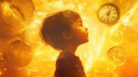 A child stands in a radiant glow, gazing upward in awe. Surrounding them are various clocks, symbolizing the passage of time and the innocence of childhood exploration.
