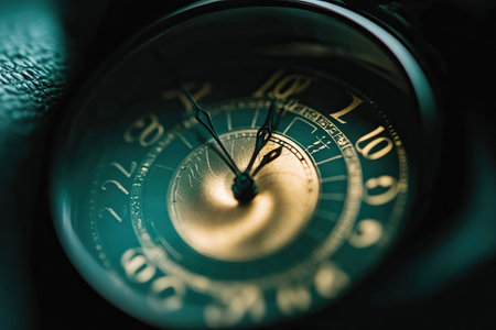 A close-up view of a vintage watch dial reveals its intricate details and the current time displayed elegantly.