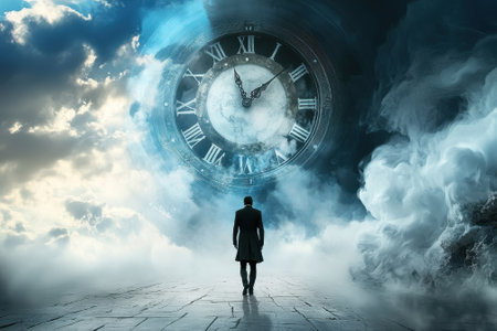 A man approaches a giant clock surrounded by clouds, creating a mysterious atmosphere at dusk.