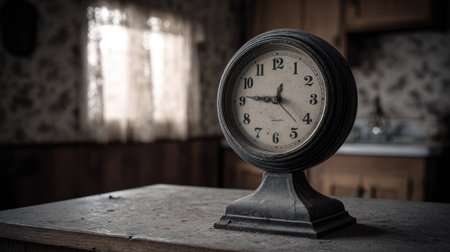 A vintage clock placed on a dusty table in an abandoned kitchen, showcasing rustic decor and a nostalgic atmosphere that evokes memories of the past.
