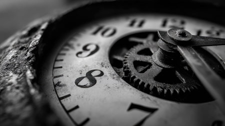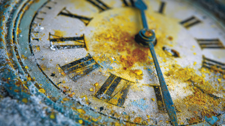 A close view of an antique clock highlighting its weathered surface, aged numbers, and rust with vivid textures, capturing the essence of times passage.