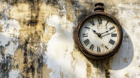 This image features a vintage clock mounted on a weathered wall, showcasing rustic charm and timeless beauty. Perfect for design or decor projects.