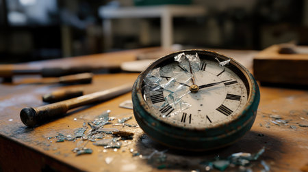 A broken antique clock rests on a wooden worktable, scattered with shards of glass and various tools, showcasing themes of time, decay, and craftsmanship.