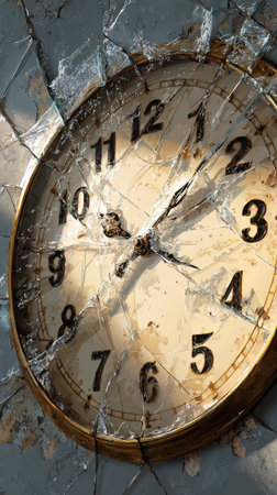 The image presents a clock face encased in shattered glass, suggesting a concept of time. The composition showcases a vintage clock with visible cracks across the surface. The lighting appears natural, enhancing the texture of the old clock. This image could be used for various commercial and editorial applications.