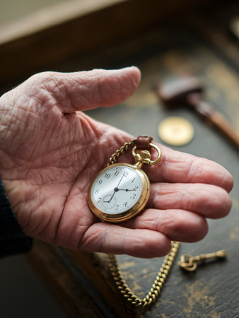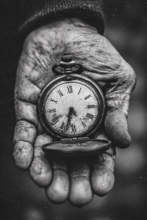An aged hand, textured and weathered, delicately holds an antique pocket watch. The image, in monochrome, highlights the details of the watch face and the hand's wrinkles. The composition, likely taken indoors under soft lighting, evokes themes of time, history, and the passage of life, suitable for editorial and commercial use.