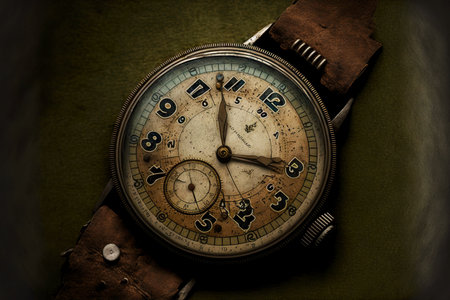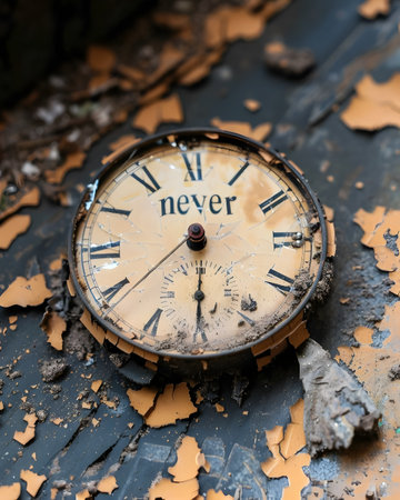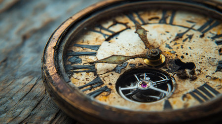 An old, broken watch with its hands stopped, emphasizing the concept of time slipping away. The image evokes feelings of past memories, the speed of life, and the uncertainty of the future.99a7-e37bc54301df