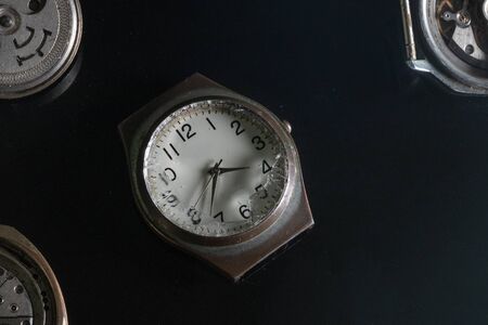 time concept. Extreme closeup of very old wristwatch with dust