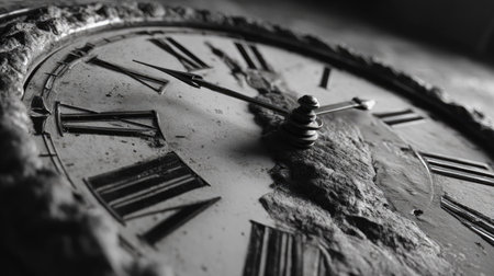 This monochrome image features a close-up of an antique clock face, showcasing its intricate Roman numerals and hour hand, evoking a sense of nostalgia and timelessness.