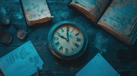 A captivating still life image featuring a rustic vintage clock surrounded by yellowed letters and old papers, symbolizing the passage of time and forgotten stories.