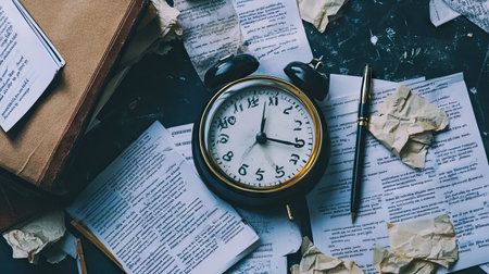A vintage alarm clock rests on a messy desk filled with crumpled papers, books, and a pen, symbolizing the chaos of time management and creativity.