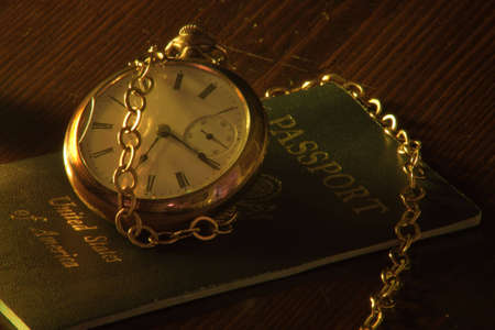 A close up of a pocket watch and a US passport.