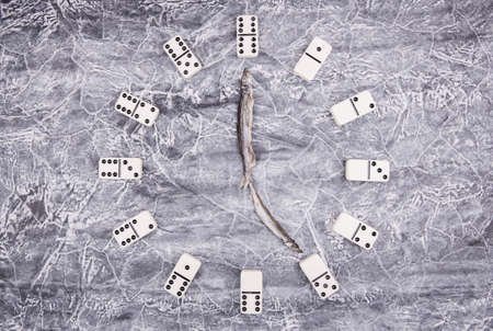 Hours with shooters from fish and dominoes on a marble concrete background. Five hours