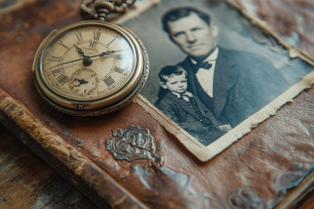 Antique pocket watch laying on a leather bound photo album showing an old black and white family photo