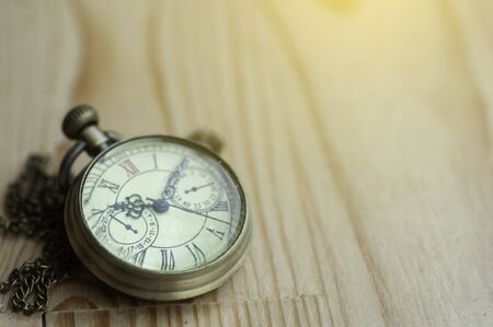 Close up mini vintage pocket watch 10 hour 10 minutes on wooden table with light of sun rise, classic clock style retro concept.