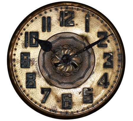 The old watch face close-up shows the time around ten o'clock and ten minutes.