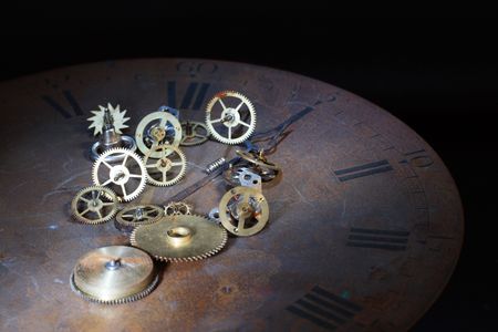 Steampunk background from mechanical clocks details over old metal background. Inside the clock, gears