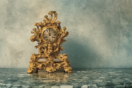 Clock and chandelier standing on the mantel in the luxurious interior of the old