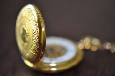 Close up of Vintage pocket watch on wood background, selective focus and vignette effect concept.