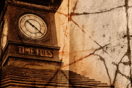 Grunge clock tower with words Time Flies carved in wood in London, Europe