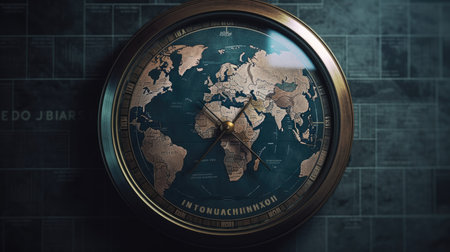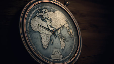 Close-up of the dial of a vintage watch with world map on the dial. Earth's Time Concept. Generative AI