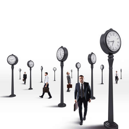 Businessman looking at the big wall of clocks. Time management concept