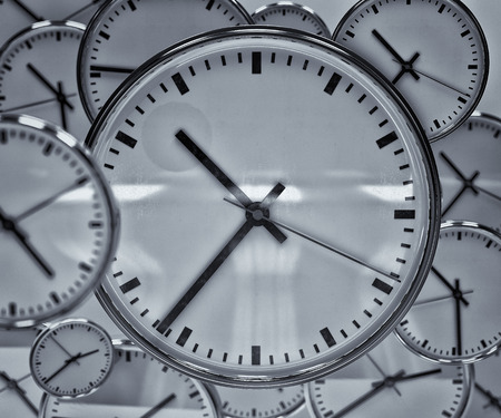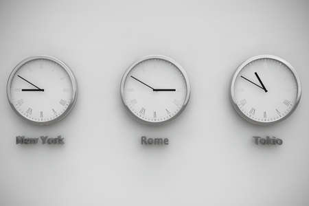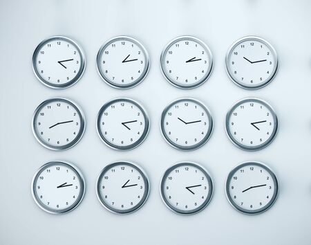 Time zones concept. Many clock on white wall. Close Up. 3D rendering