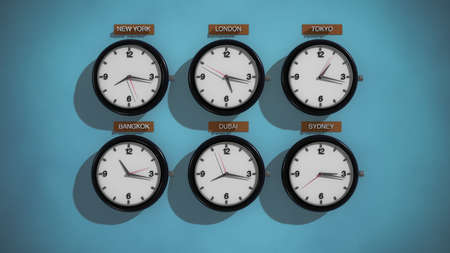 Modern wall clocks showing different time zones of world cities. 3D illustration.