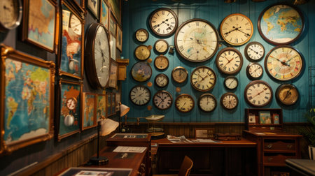 Discover a captivating vintage office space featuring a world map and numerous clocks representing different time zones, perfect for inspiring creativity and productivity.
